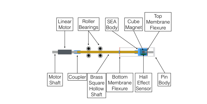 It was also difficult to calibrate because of the nonlinear response of the FSRs. To solve these problems, I designed several iterations using Series Elastic Actuators for force control that would measure displacement using the proximity of magnets to hall-effect sensors (Allegro A1454). The challenge was to design an SEA mechanism that could fit inside each pin, which is only 20mm square and 120mm tall. These designs worked better, but proved too complicated to manufacture and assemble for all 50 pins.